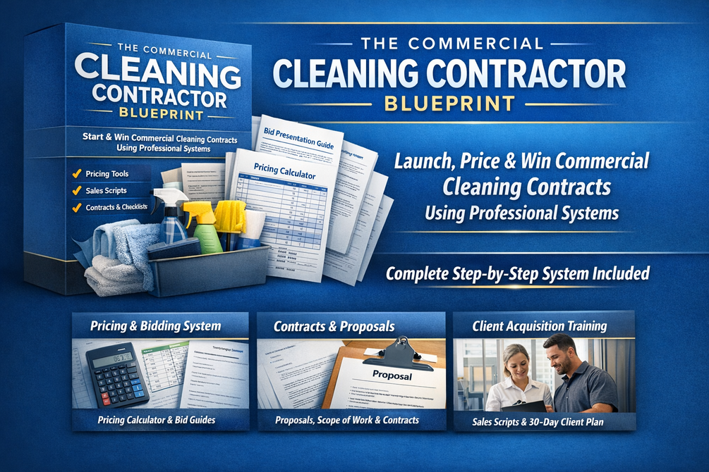 The Commercial Cleaning Contractor Blueprint is a complete step-by-step system showing you how to start, price, and win commercial cleaning contracts using professional contractor systems. Instead of guessing what to charge or how to find clients, you get the exact pricing tools, proposals, contracts, outreach scripts, hiring systems, and operations checklists used to launch and run a real commercial cleaning business. Whether you’re starting from scratch or trying to move from residential cleaning into commercial contracts, this blueprint gives you everything needed to look professional, land recurring clients, and build predictable monthly income. Stop guessing. Start winning commercial cleaning contracts with systems that actually work.